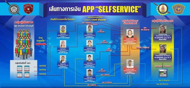 ในส่วนของแอปพลิเคชัน “กระเป๋าให้ท่านมีที่ยืม” มีแอปพลิเคชันอื่นที่เกี่ยวข้องกว่า 20 แอปพลิเคชัน จากการตรวจสอบพบว่าไม่เคยได้รับอนุญาตให้ประกอบธุรกิจสินเชื่อส่วนบุคคลภายใต้กำกับแต่อย่างใด โดยภายในระยะเวลา 6 เดือน กลุ่มคนร้ายใช้บัญชีธนาคารกว่า 20 บัญชี ในการกระทำความผิด มียอดเงินหมุนเวียนสูงถึง 1,000 ล้านบาท เมื่อได้กำไรจากการปล่อยเงินกู้นอกระบบแล้วจะรีบโอนเงินออกเป็นทอดๆ ในระยะเวลาที่รวดเร็ว และในส่วนของแอปพลิเคชัน “Self service” พบว่าไม่ได้รับอนุญาตให้ประกอบธุรกิจสินเชื่อส่วนบุคคลภายใต้กำกับเช่นเดียวกัน โดยภายในระยะเวลา 6 เดือน พบว่ากลุ่มคนร้ายใช้บัญชี 11 บัญชี ในการกระทำความผิด มียอดเงินหมุนเวียนกว่า 1,500 ล้านบาท และมีการโอนเงินออกเป็นทอดๆ เช่นเดียวกัน นอกจากนี้ทั้งสองแอปพลิเคชันมีการนำกำไรดังกล่าวไปซื้อเป็นเหรียญคริปโตเคอเรนซี อุปกรณ์คอมพิวเตอร์ สินค้าและบริการ เพื่อให้ยากต่อการถูกตรวจสอบจากเจ้าหน้าที่