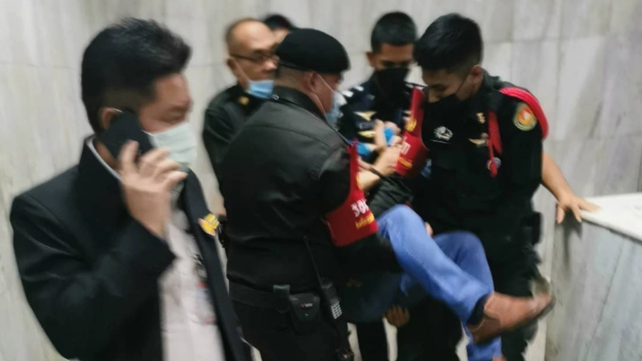 ระหว่างนี้ นายประสิทธิ์เดินผ่าน รปภ.ศาลชั้น 9 ที่คุ้นหน้ากัน แต่ทางรปภ.ก็จำได้ทันทีและก็ประหลาดใจที่นายประสิทธิ์ไม่สวมชุดนักโทษกับสงสัยว่า ได้ประกันตัวไปตั้งแต่เมื่อใด ทำไม รปภ.ไม่ทราบ แต่นายประสิทธิ์แทนที่จะทัก รปภ.กลับเดินจ้ำก้มหน้าก้มตา เดินกึ่งกระโดด จังหวะเดียวกันมีคนตะโกนไล่หลังมาว่า ผู้ต้องขังหนีบ้าง คนจะโดดตึกบ้าง ฟังไม่ได้ศัพท์ ทางรปภ.ชั้น 9 จึงวิ่งไล่ตามทันที นายประสิทธิ์จึงกระโดดลงบันไดจนเท้าพลิกและรองเท้าหลุด จนมาถูกจับได้ที่ชั้นสามหน้าที่ทำการกองคลัง