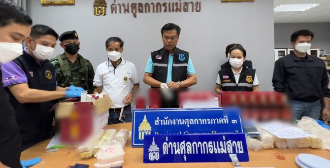 – เมื่อวันที่ 19 พฤศจิกายน 2565 เจ้าหน้าที่กรมศุลกากร พร้อมด้วยทหาร กองกำลังผาเมือง และเจ้าหน้าที่ ป.ป.ส. เข้าตรวจสอบ บริษัทขนส่ง (สาขาป่าเหมือด) อำเภอแม่สาย จังหวัดเชียงราย พบพัสดุและสิ่งของที่อายัดไว้จำนวนหนึ่งก่อนหน้านี้ ซึ่งนำเข้าจากต่างประเทศ มีลักษณะต้องสงสัย โดยหีบห่อและน้ำหนักผิดปกติ จึงได้ทำการตรวจสอบ ผลการเปิดตรวจกล่องพัสดุ จำนวน 8 หีบห่อ พบกล่องสุราต่างประเทศ ภายในบรรจุยาเสพติดให้โทษประเภท 1 เมทแอมเฟตามีน (ยาบ้า) รวม 387,840 เม็ด มูลค่า 31,027,200 บาท