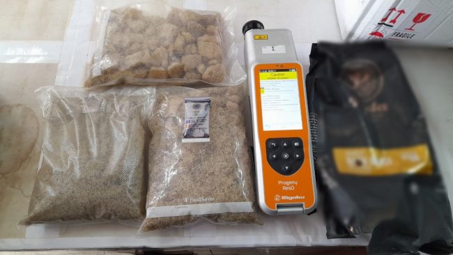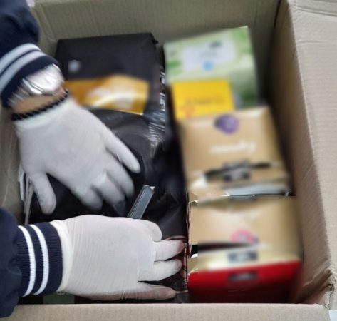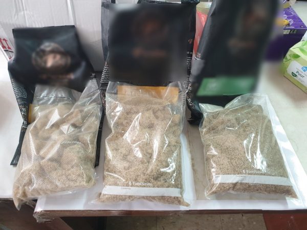 จึงร่วมกับเจ้าหน้าที่จากสำนักงานคณะกรรมการป้องกันและปราบปรามยาเสพติด (ป.ป.ส.) เจ้าหน้าที่ตำรวจ และเจ้าหน้าที่ศูนย์รักษาความปลอดภัย กองบัญชาการกองทัพไทย (ศรภ.) และพนักงาน บริษัท ไปรษณีย์ไทย จำกัด เปิดตรวจพัสดุดังกล่าว ภายในพบถุงกาแฟ จำนวน 3 ถุง ปะปนมากับกล่องชาชนิดต่างๆ เมื่อเจ้าหน้าที่ใช้มือบีบดูถุงกาแฟทั้งสามมีลักษณะผิดปกติ จึงทำการเปิดถุงกาแฟทั้ง 3 ถุง เพื่อตรวจสอบพบถุงพลาสติกใสบรรจุเกล็ดสีน้ำตาล-ขาวน้ำหนักรวมสิ่งห่อหุ้มประมาณ 3.01 กิโลกรัม เจ้าหน้าที่จึงนำเกล็ดสีน้ำตาล-ขาว ดังกล่าว ไปทดสอบด้วยน้ำยา MARQUIS REAGENT พบว่าทำปฏิกิริยากับน้ำยาทดสอบเปลี่ยนจากใสเป็นสีเทาดำในเวลาต่อมา