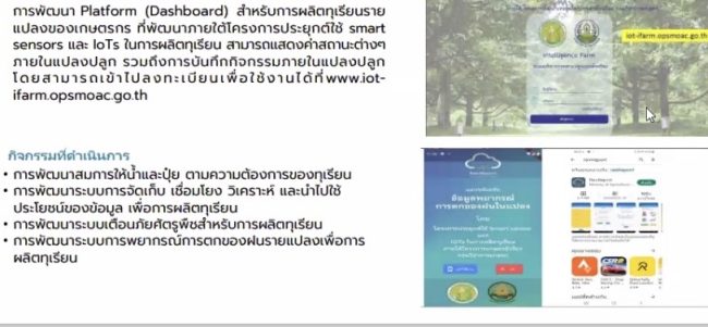 การจัดทำเสนอโครงการการพัฒนาและวิจัยที่จะดำเนินการเสนอ สวก. ในการของงบประมาณการวิจัย 3 โครงการ ได้แก่ โครงการการพัฒนา IoTs Platfrom สำหรับการผลิตทุเรียนแปลงใหญ่อัจฉริยะ โครงการการพัฒนาแอปพลิเคชันทำนายและตรวจวิเคราะห์ศัตรูพืช (โรคพืช แมลงศัตรูพืชและวัชพืช) ด้วยเทคโนโลยีปัญญาประดิษฐ์ (AI) และการพัฒนาเครื่องจักรกลการเกษตรอัจฉริยะ (เครื่องสาง + ม้วนใบอ้อย) เพื่อแก้ปัญหาการเผาอ้อย และรายงานความก้าวหน้าการขับเคลื่อนการดำเนินงานร่วมกับบริษัท ล็อกซ์เลย์ จำกัด (มหาชน)เพื่อขับเคลื่อนแปลงใหญ่เกษตรอัจฉริยะข้าว ปัจจุบันอยู่ในระหว่างการหารือประเด็นสนับสนุนการลดภาษีการนำเข้าเครื่องดังกล่าว และการติดตั้งซิมการ์ด การเชื่อมโยงและการเข้าถึงข้อมูลสภาพอากาศของเกษตรกร เพื่อสนับสนุนการทำเกษตรอัจฉริยะ