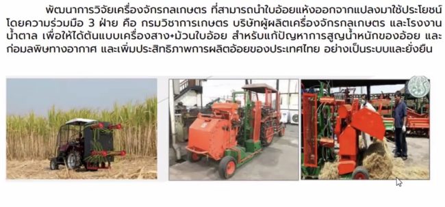 2. คณะอนุกรรมการขับเคลื่อนเกษตรอัจฉริยะ ของกระทรวงเกษตรและสหกรณ์ รายงานความก้าวหน้าของการวิจัยและพัฒนาเครื่องเก็บเกี่ยวมันสำปะหลังโดยมีการพัฒนาและวิจัยเครื่องขุดมันสำปะหลังแบบไถหัวหมู เครื่องขุดและเก็บมันสำปะหลัง เครื่องตัดต้นมันสำปะหลังแบบติดตั้งหน้ารถแทรกเตอร์ ซึ่งร่วมกับ บริษัท บีทีโอโตพาร์ท เป็นภาคเอกชนที่นำผลงานวิจัย ไปทำการผลิตและจำหน่าย เป็นการพัฒนาและต่อยอดผลการวิจัยข้างต้นให้เป็นต้นแบบ “เครื่องเก็บเกี่ยวมันสำปะหลังแบบกึ่งอัตโนมัติ”