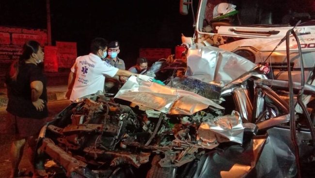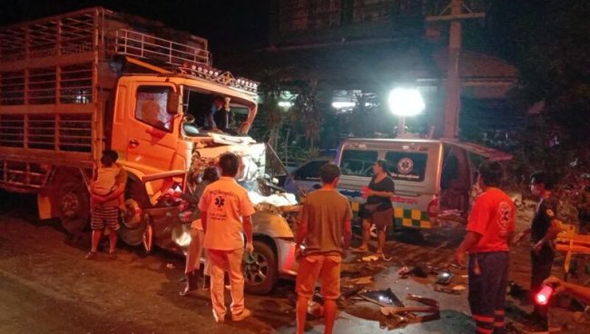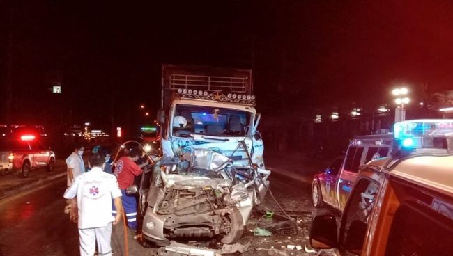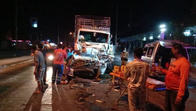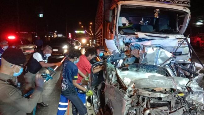 สมุทรสาคร-คนขับรถบรรทุกหมูหลับในพุ่งชนสนั่นกระบะอัดก๊อบปี้สิบล้อคาไฟแดงสาวรอดตายปาฏิหาริย์ขณะขับรถมารับบัตรคิวรพ.ให้แม่