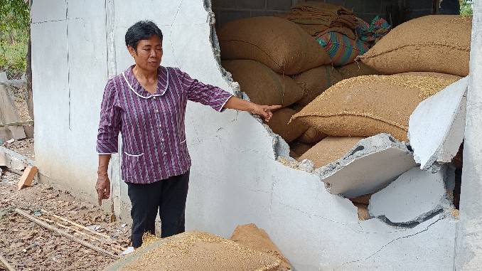 จึงเดินทางไปยังบ้านหลังดังกล่าวพบเจ้าของบ้านและจิตอาสาเฝ้าระวังช้างป่า เจ้าหน้าที่อบต.ลงพื้นที่ตรวจสอบ เป็นยุ้งข้าวเปลือกปลูกติดพื้น ซึ่งเจ้าของบ้านเก็บข้าวเปลือกไว้ในยุ้ง 44 กระสอบ เอาไว้เป็นเมล็ดพันธุ์-เก็บไว้สีเป็นข้าวสาร ถูกช้างป่าพังผนังยุ้งข้าวด้านหน้าแตกร้าว ส่วนทางด้านหลังมีรอยช้างป่าพังผนังยุ้งข้าวเป็นรูขนาดใหญ่ และยกข้าวเปลือก1 กระสอบป่านที่บรรจุข้าวเปลือกเต็มกระสอบออกมาวางไว้ด้านนอกจำนวน 2 กระสอบ ถูกช้างป่าดึงกระสอบฉีกขาดกินข้าวเปลือกเสียหายไป 1 กระสอบ