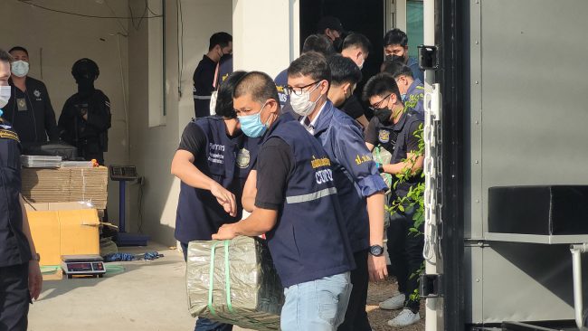 นายวิชัย ไชยมงคล เลขาธิการ ป.ป.ส. เผยว่า สืบเนื่องจากวันที่ 9 มกราคม 2566 หน่วยปราบปรามและสกัดกั้นยาเสพติดในพื้นที่ท่าเรือ (Seaport Interdiction Task Force : SITF) ได้ตรวจสอบสินค้าขาออกสำแดงสินค้าเป็นพรม ประเทศปลายทางฮ่องกง ส่งออกทางท่าเรือกรุงเทพ ก่อนพบยาเสพติดให้โทษประเภท 1 (ไอซ์) น้ำหนักรวมสิ่งห่อหุ้มทั้งหมดประมาณ 51 กิโลกรัม เจ้าหน้าที่จึงขยายผลก่อนทราบว่ายาเสพติดดังกล่าวถูกส่งมาจากบ้านพักใน จ.สมุทรปราการ จึงเข้าสังเกตการณ์และวางกำลังโดยรอบ จนกระทั่งในเวลา 18.35 น. พบ MR.YONG MING SHI (สัญชาติจีน) ซึ่งเป็นผู้ต้องหารายที่ 1 พร้อมกระเป๋าสะพายหลังสีดำ จำนวน 2 ใบ ออกมาจากบ้านดังกล่าว จึงได้แสดงตัวทำการตรวจค้นบุคคล จากการตรวจค้นพบยาเสพติดให้โทษในประเภท 1 (เฮโรอีน) ลักษณะเป็นผงสีขาวขุ่น ซุกซ่อนอยู่ภายในโบรชัวร์ขายบ้านเคลือบพลาสติกใส น้ำหนักรวมสิ่งห่อหุ้มประมาณ 13 กิโลกรัม เจ้าหน้าที่จึงจับกุม ก่อนเข้าตรวจค้นภายในบ้านพบ ยาเสพติดให้โทษในประเภท 1 (ไอซ์) น้ำหนักรวมสิ่งห่อหุ้มประมาณ 21 กรัม และ (เฮโรอีน) ซุกซ่อนในร่มน้ำหนักรวมประมาณ 35 กิโลกรัม และอุปกรณ์ การแพ็คบรรจุจำนวนมาก
