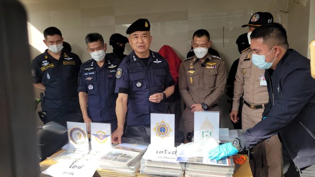 นายวิชัย ไชยมงคล เลขาธิการ ป.ป.ส. เผยว่า สืบเนื่องจากวันที่ 9 มกราคม 2566 หน่วยปราบปรามและสกัดกั้นยาเสพติดในพื้นที่ท่าเรือ (Seaport Interdiction Task Force : SITF) ได้ตรวจสอบสินค้าขาออกสำแดงสินค้าเป็นพรม ประเทศปลายทางฮ่องกง ส่งออกทางท่าเรือกรุงเทพ ก่อนพบยาเสพติดให้โทษประเภท 1 (ไอซ์) น้ำหนักรวมสิ่งห่อหุ้มทั้งหมดประมาณ 51 กิโลกรัม เจ้าหน้าที่จึงขยายผลก่อนทราบว่ายาเสพติดดังกล่าวถูกส่งมาจากบ้านพักใน จ.สมุทรปราการ จึงเข้าสังเกตการณ์และวางกำลังโดยรอบ จนกระทั่งในเวลา 18.35 น. พบ MR.YONG MING SHI (สัญชาติจีน) ซึ่งเป็นผู้ต้องหารายที่ 1 พร้อมกระเป๋าสะพายหลังสีดำ จำนวน 2 ใบ ออกมาจากบ้านดังกล่าว จึงได้แสดงตัวทำการตรวจค้นบุคคล จากการตรวจค้นพบยาเสพติดให้โทษในประเภท 1 (เฮโรอีน) ลักษณะเป็นผงสีขาวขุ่น ซุกซ่อนอยู่ภายในโบรชัวร์ขายบ้านเคลือบพลาสติกใส น้ำหนักรวมสิ่งห่อหุ้มประมาณ 13 กิโลกรัม เจ้าหน้าที่จึงจับกุม ก่อนเข้าตรวจค้นภายในบ้านพบ ยาเสพติดให้โทษในประเภท 1 (ไอซ์) น้ำหนักรวมสิ่งห่อหุ้มประมาณ 21 กรัม และ (เฮโรอีน) ซุกซ่อนในร่มน้ำหนักรวมประมาณ 35 กิโลกรัม และอุปกรณ์ การแพ็คบรรจุจำนวนมาก