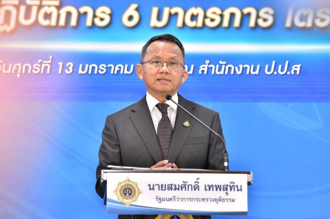 วันที่ 13 ม.ค.66 เมื่อเวลา 11.00 น. นายสมศักดิ์ เทพสุทิน รัฐมนตรีว่าการกระทรวงยุติธรรม เป็นประธานแถลงข่าวผลงานการแก้ไขปัญหายาเสพติดตามแผนปฎิบัติการ 6 มาตรการ ไตรมาสที่ 1 โดยมี Mr.Jeremy Douglas ผู้แทน UNODC Mr.Marc Lang เจ้าหน้าที่สืบสวนพิเศษ DEA น.ส.ณัฐธ์ภัสส์ ยงใจยุทธ ผู้ช่วย รมว.ยุติธรรม นายธนวัชร นิติกาญจนา ที่ปรึกษา รมว.ยุติธรรม นายวิชัย ไชยมงคล เลขาธิการ ป.ป.ส. ร่วมแถลง ที่สำนักงาน ป.ป.ส.