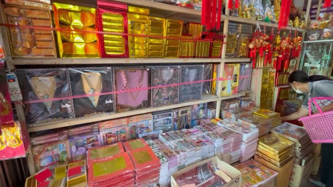 นายศักรินทร์ ทัศนวัฒน์ เจ้าของร้านกิมไทย กล่าวว่า ปีนี้คึกคักกว่าปีที่ผ่านมาแต่ต้องรอดูสถานการณ์วันจ่ายอีกรอบว่าจะเป็นยังไงบ้างแต่ช่วงที่ผ่านมาถ้าเทียบกับปีที่แล้วถือว่าขายดีขึ้น ราคาสินค้าของไหว้ราคาสูงขึ้นเพราะที่ร้านจะเอาสินค้าอย่างดีมีมาตรฐานมาขายวัตถุดิบต่างๆจะนำมาจากประเทศรัสเซียและตอนนี้รัสเซียมีภาวะสงครามทำให้ราคาสินค้าสูงขึ้นการขนส่งชิปปิ้งมีปัญหาสินค้าที่ขึ้นราคาอย่างชัดเจนคือกระดาษไหว้ทุกตัวขึ้นราคาหมด กระดาษเงินกระดาษทองขึ้นราคาอย่างละ 5-10 บาท เพราะวัตถุดิบกระดาษนำมาจากประเทศรัสเซียต้นทุนสูงขึ้น