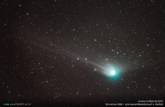 เมื่อเวลา 23.30 น.วันนี้ 28 ม.ค.66 ผู้สื่อข่าว จ.ปราจีนบุรีรายงานว่า ได้รับแจ้งจากงานประชาสัมพันธ์และสื่อสารองค์กร สถาบันวิจัยดาราศาสตร์แห่งชาติ (องค์การมหาชน) (สดร.) กระทรวงการอุดมศึกษา วิทยาศาสตร์ วิจัย และนวัตกรรม (อว.) เผยดาวหาง C/2022 E3 (ZTF) (ซีสองศูนย์สองสอง อีสาม แซดทีเอฟ) เริ่มมองเห็นด้วยตาเปล่าเหนือฟ้าเมืองไทย ในพื้นที่มืดสนิท ติดตามชมได้ตั้งแต่ช่วงนี้จนถึงต้นเดือนกุมภาพันธ์ 2566 ปรากฏทางทิศเหนือ บริเวณกลุ่มดาวยีราฟ แนะชมผ่านกล้องโทรทรรศน์ หรือกล้องสองตา จะเห็นชัดเจนยิ่งขึ้น