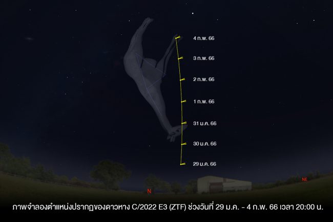 นายศุภฤกษ์ คฤหานนท์ ผู้อำนวยการศูนย์บริการวิชาการและสื่อสารทางดาราศาสตร์ สดร. เปิดเผยว่า ขณะนี้ดาวหาง C/2022 E3 (ZTF) เริ่มสังเกตเห็นได้ด้วยตาเปล่าในพื้นที่มืดสนิท ทางทิศเหนือ บริเวณกลุ่มดาวยีราฟ (Camelopardalis) ตั้งแต่เวลาประมาณ 22:00 น. ทั้งนี้ ช่วงต้นเดือนกุมภาพันธ์ เป็นช่วงที่ดาวหางดวงนี้เข้าใกล้โลกมากที่สุด (ระหว่างวันที่ 1-2 กุมภาพันธ์) จะสามารถสังเกตได้ตั้งแต่ดวงอาทิตย์ลับขอบฟ้าจนกระทั่งรุ่งสางก่อนดวงอาทิตย์ขึ้นของวันถัดไป และคาดว่าจะมีความสว่างเพิ่มมากขึ้นอีกเล็กน้อย