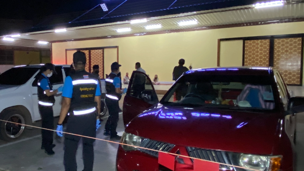 ที่เกิดเหตุอยู่บริเวณลานจอดรถด้านหน้าอาคารจัดเลี้ยง พบรถกระบะยี่ห้อมิตซูบิชิ ตอนครึ่ง สีแดง ทะเบียนกระบี่ จอดเปิดประตูฝั่งคนขับทิ้งไว้ ที่พื้นข้างรถและที่เบาะนั่งคนขับพบคราบเลือดกองใหญ่ ที่วางเท้าฝั่งคนขับพบปลอกกระสุนปืนขนาด 9 มม. ตกอยู่ 1 ปลอก ส่วนผู้บาดเจ็บทราบชื่อคือ นายสมคิด แบนเสมอ อายุ 36 ปี ชาวจังหวัดสุราษฎร์ธานี ถูกยิงด้วยอาวุธปืนกระสุนเข้าที่ไหล่ขวา 1 นัด กลางหน้าอก 1 นัด อาการสาหัส และถูกนำตัวส่ง รพ.ไปก่อนหน้า