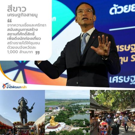 “นายกอุ๊ ก็คือที่ปรึกษาด้านนโยบายของชาติพัฒนากล้าด้วย พวกเราเห็นความสำคัญของเรื่องนี้เป็นอย่างมาก เพราะเศรษฐกิจสีขาว หรือสายมู ที่ถ้าเราลงทุนหลักพันล้านต่อ 1 แหล่งท่องเที่ยว เราจะได้เงินกลับคืนมาอย่างมหาศาล ดูแหล่งท่องเที่ยวระดับโลกอย่างเจ้าแม่กวนอิมที่ฮ่องกง วัดอาซากุสะที่ญี่ปุ่น โบสถ์ที่งดงามในยุโรป หรือแม้แต่พระพรหมเอราวัณที่บ้านเรา ต่างก็เป็นสถานที่ท่องเที่ยวที่คนทั่วโลกอยากมาชมด้วยตาตัวเอง”นายกรณ์ กล่าว