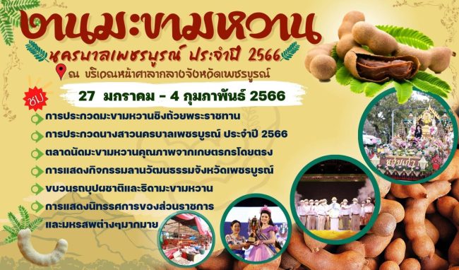 นายกฤษณ์ คงเมือง ผู้ว่าราชการจังหวัดเพชรบูรณ์ได้เชิญชวนเที่ยวงาน “50 ปี มะขามหวาน นครบาลเพชรบูรณ์” ประจำปี 2566 ซึ่งจะมีการจัดระหว่างวันนี้ ม.ค.-4 ก.พ.2566 ภายในงานเน้นเชิงการอนุรักษ์วัฒนธรรมประเพณีในเชิงสร้างสรรค์และกิจกรรมความบันเทิง ความสนุกสนานสร้างความเป็นอัตลักษณ์ของชาวเพชรบูรณ์ เพื่อส่งเสริมการท่องเที่ยวเป็นการกระตุ้นเศรษฐกิจและพัฒนาคุณภาพชีวิตเสริมสร้างความมั่นคงของประชาชนโดยเฉพาะเด็ก เยาวชน สตรีผู้สูงอายุ ผู้ยากไร้และผู้ด้อยโอกาสและช่วยเหลือเกษตรกร อนุรักษ์การปลูกมะขามให้มีคุณภาพเพื่อให้มะขามหวานคงอยู่คู่กับชาวเพชรบูรณ์สืบไป อีกทั้งให้จังหวัดเพชรบูรณ์กลับมาคึกคักอีกครั้ง
