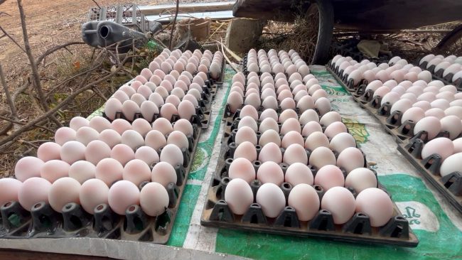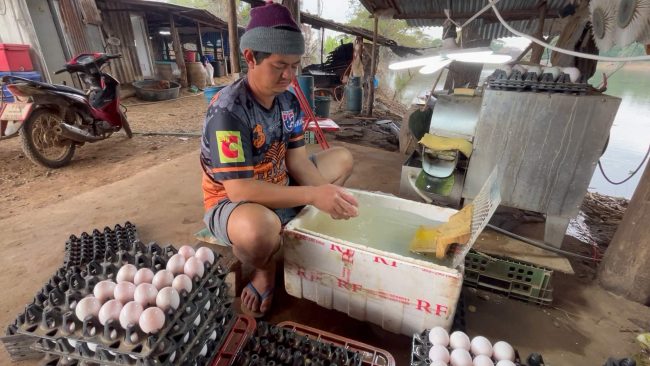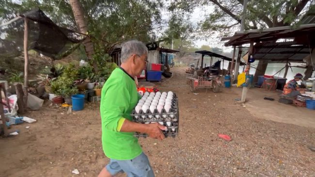 ” ที่อยู่ได้เพราะว่านำมาแปรรูปเป็นไข่เค็ม สาเหตุที่ราคาอาหารสัตว์ขึ้นเพราะมาจากประเทศยูเครนติดสงครามส่งออกอาหารวัตถุดิบไม่ได้ และช่วงที่ผ่านมารัฐบาลขึ้นค่าไฟฟ้าโรงงานอาหารสัตว์ราคาสูงขึ้นอีก ช่วงอากาศหนาวที่ผ่านมาไม่มีอุปสรรคต่อการเลี้ยงเป็ดไข่แต่เป็นผลดีเพราะเป็ดไข่ชอบอากาศเย็นและออกไข่เพิ่มจากเดิมวันละ 60 แผง เพิ่มเป็นวันละ 62 แผง เพิ่มขึ้นมาเล็กน้อย”