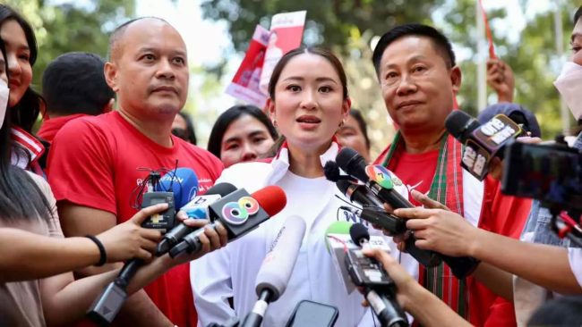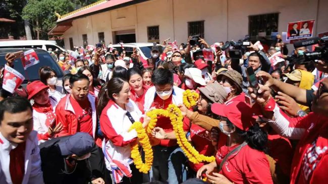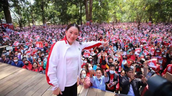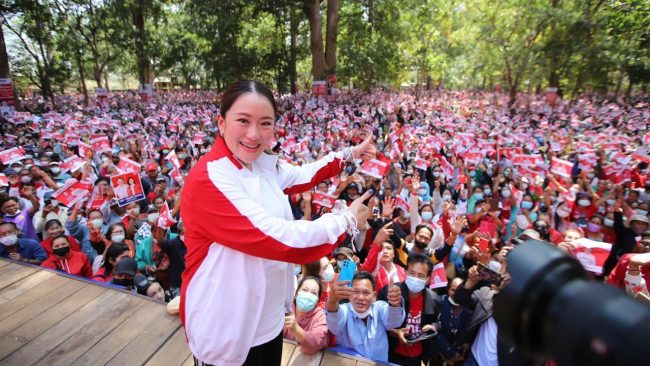 เมื่อวันที่ 17 ก.พ. 66 ที่ท่าอากาศยานอุบลราชธานี น.ส.แพทองธาร ชินวัตร หัวหน้าครอบครัวเพื่อไทย พร้อมคณะผู้บริหาร ส.ส. ผู้ซึ่งประสงค์สมัครรับเลือกตั้ง ส.ส. ตลอดจนสมาชิกพรรคเพื่อไทย (พท.) เดินทางมาถึง จ.อุบลราชธานี เพื่อเปิดเวทีปราศรัยใหญ่สามเวทีประกอบด้วย เวทีปราศรัยย่อยวัดม่วงเดียด หลวงพ่อลี อ.ตระการพืชผล เวทีปราศรัยโรงเรียนมัธยมเดชอุดม อ.เดชอุดม และเวทีปราศรัยใหญ่ ที่ศาลากลางเก่า อ.เมือง โดยมี นายเกรียง กัลป์ตินันท์ แกนนำพรรคเพื่อไทย รวมถึงส.ส.ในพื้นที่และประชาชนมารอต้อนรับเป็นจำนวนมาก พร้อมขอถ่ายภาพเซลฟี่ มอบดอกกุหลาบแดง เพื่อเป็นกำลังใจให้น.ส.แพทองธาร และส่งเสียงเชียร์ให้น.ส.แพทองธาร ได้เป็นนายกฯ