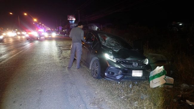 ที่เกิดเหตุห่างไปเกือบ 50 เมตรพบรถเก๋ง ฮอนด้า แจ๊ส สีดำ ทะเบียน 7กฮ 4467 กรุงเทพมหานคร เสียหลักตกไหล่ทาง ด้านหน้าพังเสียหาย กระจกหน้ารถแตก พบ น.ส.ศศิวิมล อินทแสน อายุ 24 ปี คนขับนั่งอยู่ภายในรถและร้องไห้ตลอดเวลาด้วยอาการตกใจ โดยให้การว่าขณะที่กำลังขับรถกลับที่พักที่บางปะกง โดยขับอยู่เลนขวาจนมาถึงที่เกิดเหตุตนไม่เห็นว่ามีคนเดินข้ามถนน พอเห็นก็จวนตัวแล้วทำให้พุ่งชนเต็มแรงจนร่างคนที่ถูกชนศีรษะทะลุกระจกเข้ามาก่อนจะลอยกระเด็นตกพื้นไกลกว่า50 เมตร แล้วตนก็พยายามประคองรถให้จอดไหล่ทาง