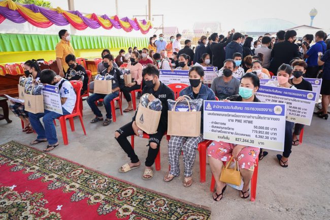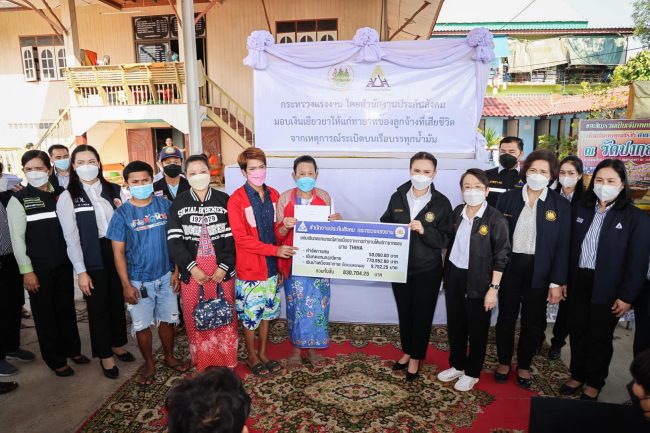 ต่อมา สนง.ประกันสังคม จ.สมุทรสาคร ได้ลงพื้นที่มอบเงินเยียวยาให้แก่ญาติผู้เสียชีวิต โดยแต่คนจะได้รับเงินคนละ 8 แสนกว่าบาท ซึ่งแบ่งออกเป็น 3 ส่วนคือ ค่าจัดการศพ 50,000 บาท เงินทดแทนกรณีเสียชีวิต 770,952 บาท และเงินบำเหน็จชราภาพ ขึ้นอยู่กับระยะเวลาการทำงาน ส่วนใหญ่จะได้เงินเยียวยาอยู่ที่ระหว่าง 820,984 – 830,704 บาท