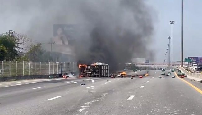 เกิดอุบัติเหตุสุดระทึกขวัญ รถบรรทุกถังแก๊สหุงต้ม เสียหลักพลิกคว่ำบนถนนมอเตอร์เวย์ ไฟลุกท่วมโชเฟอร์หวิดดับ เสียงระเบิดดังเป็นระยะ เจ้าหน้าที่ต้องให้รถย้อนศรเพื่อหลีกเลี่ยง ก่อนเคลียร์เส้นทางจราจร