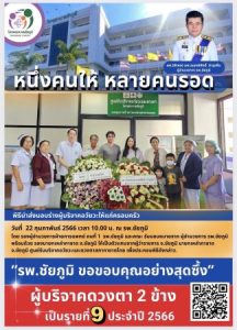โดยทางโรงพยาบาลชัยภูมิได้ซาบซึ้งและกล่าวขอบคุณกับบรรดาญาติพี่น้อง และบุตรหลาน ของผู้ใจบุญผู้เสียชีวิตแล้ว ที่ยอมเสียสละอวัยวะ(ดวงตา) ในครั้งนี้เพื่อมอบไว้ให้เป็นคุณประโยชน์ทางการแพทย์และแด่เพื่อนมนุษย์ ซึ่งถือได้ว่าบุญมหากุศลที่ยิ่งใหญ่ในการเสียสละเป็นอย่างมากอีกด้วย///