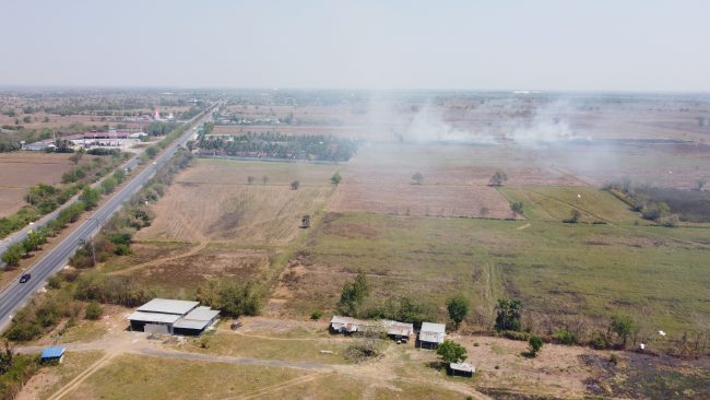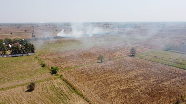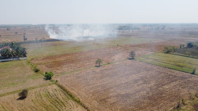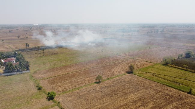 ภาพมุมสูงถ่ายจากโดรนที่บินบันทึกภาพพื้นที่ที่ชาวนาลักลอบจุดไฟเผาตอซังข้าวกลางทุ่งนาในตำบลธารปราสาท อำเภอโนนสูง จังหวัดนครราชสีมา ทำให้เกิดกลุ่มควันไฟลอยขึ้นท้องฟ้าปกคลุมเป็นบริเวณกว้างทั่วหมู่บ้านและชุมชน ส่งผลกระทบสร้างความเดือดร้อนให้กับชาวบ้านในพื้นที่ โดยเฉพาะเด็กและผู้สูงอายุเสี่ยงทำให้ป่วยมีปัญหาเกี่ยวกับระบบทางเดินหายใจ และกลุ่มควันยังลอยปกคลุมถนนมิตรภาพ เป็นระยะทางหลายกิโลเมตร สร้างความเดือดร้อนให้กับผู้ใช้รถใช้ถนน ในบริเวณดังกล่าว