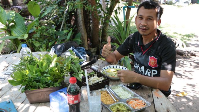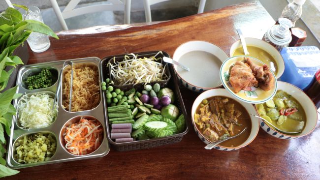มันไม่ใช่รสชาติของเราพอกินปุบ มันจะออกหวานนิดหนึง ออกเค็มนิดหนี่ง ยังไม่ใช่ ยังไม่เป๊ะ ก็เลยกลับมาทำเป็นของตนเอง พอลองขายดูก็ ผลตอบรับดีมาก ลูกค้าชอบในรสชาติเหมือนที่เราชอบ เครื่องแกงเราทำเองทุกอย่าง ตั้งแต่คั่นกะทิ เลือกวัตถุดิบมาปั่นเองตำเองทุกอย่าง อย่างไก่ทอดเรา เลือกไก่มาไก่สด ไม่ใช่ไก่แพค มาชำแหละเอง มาหมักเอง หมักสัก 2-3 ชั่วโมง ก็เอามาทอด ผักของเราก็จะมีหลากหลาย จะมีสะตอ สายบัว ถั่วฝักยาว มะเขือลาย มะเขือม่วง แตงกวา มะระขี้นก และก็จะมี… มาทานเองดีกว่า..ต้องมาลองที่ร้านค่ะ รับรองผักจุกจริงๆ น้ำจะมี ชาดำเย็น กับน้ำชามะนาวและน้ำอ้อย ขนมจะมี บัวลอย หัวล้าน ทับทิมกรอบ อินทนิน ลอดช่อง แล้วแต่วัน จะไม่ซ้ำ บางทีลูกค้ากินบัวลอยเป็นอาทิตย์เลยก็มี ตอนนี้ ขนมจีน 15 กิโลกรัม ขายได้ 5,000 กว่าบาท/ต่อวัน.