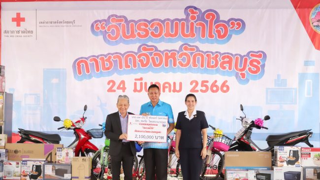 เมื่อวันที่ 24 มี.ค. 2566 ที่จวนผู้ว่าราชการจังหวัดชลบุรี อ.เมือง จ.ชลบุรี นายธวัชชัย ศรีทอง ผู้ว่าราชการจังหวัดชลบุรีพร้อมนางสาวประภัสรา ศรีทอง นายกเหล่ากาชาดจังหวัดชลบุรี คณะกรรมการและสมาชิกกาชาดจังหวัดชลบุรี ร่วมรับมอบของรางวัลต่างๆจากหน่วยงานภาครัฐ ภาคเอกชน โรงแรม ร้านอาหาร สถานประกอบการ และประชาชนที่ร่วมแรงร่วมใจกันนำมามอบให้ในงานวันรวมน้ำใจสู่กาชาด เพื่อนำไปร่วมจับรางวัลการออกร้านมัจฉากาชาดการกุศล ในงาน “กาชาดจังหวัดชลบุรี” ในงานนมัสการพระพุทธสิหิงค์ฯ และงานสงกรานต์จังหวัดชลบุรี” ประจำปี 2566 ระหว่างวันที่ 11 – 19 เมษายน 2566 ณ บริเวณสนามหน้าศาลากลางจังหวัดชลบุรี