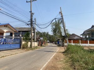 ชัยภูมิ: ชาวบ้านโอดผวาเสาไฟเอียง-สายไฟหลุดย้อยข้ามถนนเกี่ยวคอแม่ค้าสาวหวิดดับ