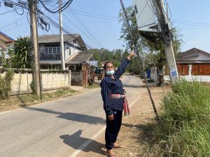 ขณะที่ชาวบ้าน ม.14 ได้พาผู้สื่อข่าวออกไปดูจุดเสียงอีกหนึ่งจุดที่มีเสาไฟฟ้าที่อยู่ในลักษณะเอียงใกล้ล้มลงมาวันไหนก็ไม่มีใครรู้โดยที่ผ่านมาได้แจ้งผู้ใหญ่บ้านไปถึงเทศบาลฯ เพื่อช่วยประสานหน่วยงานที่เกี่ยวข้อง แต่ก็ยังเงียบมาหลายเดือนแล้ว ก็มีแต่ทางเทศบาลฯที่ได้นำท่อเหล็กยาวมาช่วยพยุงกันสายไฟต้นเสาไฟไว้ไม่ให้ย่อนลงมาแต่ก็ไม่ได้ช่วยแก้ไขปัญหาได้อย่างถาวรหากมีรถบรรทุกที่มีขนาดสูงและใหญ่ก็จะมีการเกี่ยวสายไฟเกิดความเสียหายอีกด้วยจึงอยากให้ทาง จนท.หน่วยงานที่เกี่ยวข้องออกมารับผิดชอบดูแลแก้ให้เป็นระเบียบโดยเร็วด้วย///
