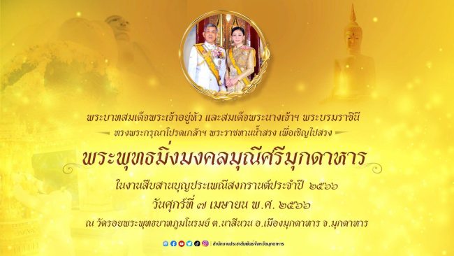 มุกดาหาร – พระบาทสมเด็จพระเจ้าอยู่หัว และสมเด็จพระนางเจ้าฯ พระบรมราชินี ทรงพระกรุณาโปรดเกล้าฯ พระราชทานน้ำสรง เพื่อเชิญไปสรง พระพุทธมิ่งมงคลมุณีศรีมุกดาหาร ในงานสีบสานบุญประเพณีสงกรานต์ประจำปี 2566