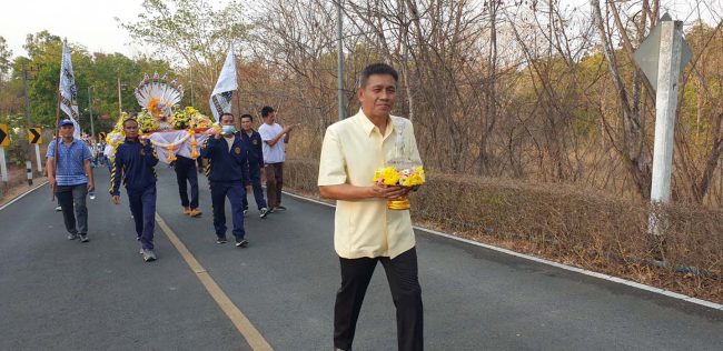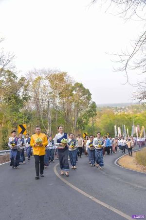 นายวรญาณ บุญณราช ผู้ว่าราชการจังหวัดมุกดาหาร นางอัญชลี บุญณราช นายกเหล่ากาชาดจังหวัดมุกดาหาร พร้อมด้วย หัวหน้าส่วนราชการ คณะนางรำทั้ง 7 อำเภอ และประชาชนทั่วไป ร่วมเดินขบวนแห่น้ำสรงพระราชทาน ขบวนเครื่องสักการะพระพุทธมิ่งมงคลมุณีครีมุกดาหาร ณ วัดรอยพระพุทธบาทภูมโนรมย์ ตำบลนาสีนวน อำเภอเมืองมุกดาหาร จังหวัดมุกดาหาร โดยขบวนเริ่มจากตีนเขามโนรมย์ ระยะทางประมาณ 2 กิโลเมตร ร่วมในพิธีครั้งนี้ประมาณ 500 คน
