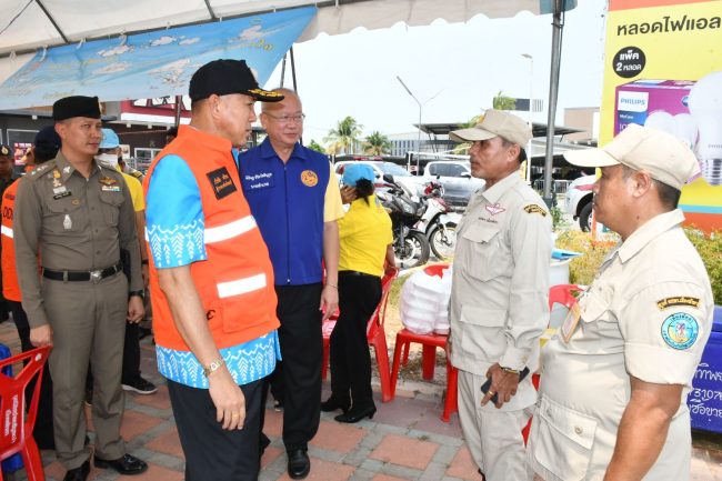 โดยมีนายพงศ์ธสิษฐ์ ปิจน์นท์ หัวหน้าสำนักงานป้องกันและบรรเทาสาธารณภัยจังหวัดชลบุรี นายพิสิษฐ สิริสวัสดินุกูล นายอำเภอบางละมุง นางพนิดา จันทวัฒน์ ประชาสัมพันธ์จังหวัดชลบุรี นายชัยพล รัตนวิสุทธิกุล ป้องกันจังหวัดชลบุรี เจ้าหน้าที่ที่เกี่ยวข้องร่วมตรวจเยี่ยมจุดบริการประชาชน