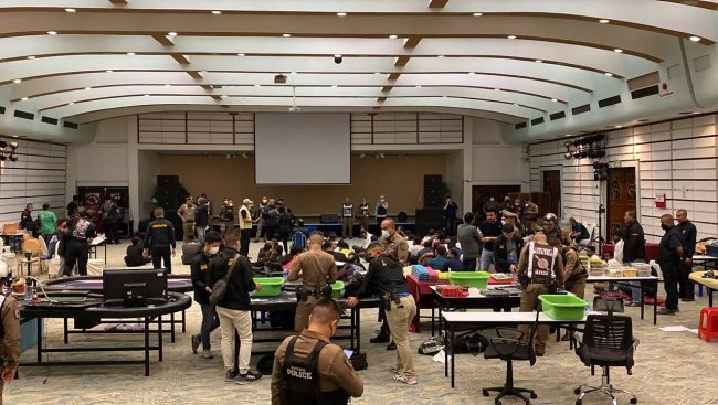 เมื่อเวลา 00.20 น. วันที่ 1 พ.ค. 2566 พล.ต.ต.กัมพล ลีลาประภาภรณ์ ผบก.ภ.จว.ชลบุรี, พ.ต.อ. พ.ต.อ.ศานติ กรเกษม ผกก.สืบสวน ภ.จว.ชลบุรี, พ.ต.อ.ฐนพงศ์ โพธิ์ทิ ผกก.สภ.เมืองพัทยา, พ.ต.อ.ปริญญา กลิ่นเกษร ผกก.ตม.จว.ชลบุรี นำกำลังตำรวจกว่า 100 นาย เข้าปิดล้อมโรงแรมชื่อดังแห่งหนึ่งใน ต.หนองปรือ อ.บางละมุง จ.ชลบุรี หลังสืบทราบว่า ภายในห้องประชุมของโรงแรม มีการลักลอบเปิดบ่อนพนันขนาดใหญ่