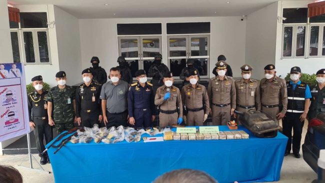 เมื่อวันที่ 9 พ.ค.2566 ที่ ศปก.ภ.จว.กาญจนบุรี พล.ต.ท.ธนายุตม์ วุฒิจรัสธำรงค์ ผบช.ภ.7 พร้อม พล.ต.ต.ไพโรจน์ คุ้มภัย ผบก.ภ.จว.กาญจนบุรี นายปกรณ์ กรรณวัลลี ปลัดจังหวัดกาญจนบุรี พ.ต.อ.กฤตชัย ทองอยู่ รอง ผบก.ภ.จว.กาญจนบุรี พ.ต.อ.มานะ สำราญวงศ์ ผกก.สส.ภ.จว.กาญจนบุรี พ.ต.อ.มนตรี แตงโต ผกก.สภ.ทองผาภูมิ ทหาร ฉก.ลาดหญ้า ตร.ชุดสืบสวน กก.สส.3 บก.สส.ภ.7 เจ้าหน้าที่ชุดสืบสวนกก.สส.ภ.จว.กาญจนบุรี เจ้าหน้าที่ตำรวจ ร้อย ตชด.135 ตร.ทางหลวง เจ้าหน้าที่ชุดปฏิบัติการปราบปรามยาเสพติด ภ.7 เจ้าหน้าที่ชุดสืบสวน กก.สส.1 บก.สส.ภ.7 เจ้าหน้าที่ตำรวจ กก.1บก.ปส.4 เจ้าหน้าที่ตำรวจ กก.1 บก.สส.สตม. ทหารหน่วยเฉพาะกิจลาดหญ้า เจ้าหน้าที่ฝ่ายปกครอง ร่วมกันแถลงผลการจับกุมกลุ่มขบวนการค้ายาเสพติดเครือข่าย ในพื้นที่ภาค 7
