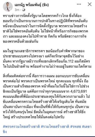 “เอกนัฏ” โพสต์ Facebook ยอมรับ เสียงของประชาชน ให้พรรคอันดับ 1 จัดตั้งรัฐบาล ระบุ ยึดมั่นจุดยืนเดิม พร้อมเป็นฝ่ายค้านหากมีการยื่นแก้กฎหมาย ม.112 และทำงานได้ในทุกหน้าที่ หลังจากนี้จะขับเคลื่อน รทสช. ให้เป็น สถาบันทางการเมือง ทันสมัย ทำงานเพื่อคนไทยทุกรุ่น สมกับที่ได้รับความไว้วางใจจากประชาชน กว่า 4 ล้านคะแนนเสียง ในการสร้างชาติไทยสู่ความมั่นคงและยิ่งใหญ่ต่อไป