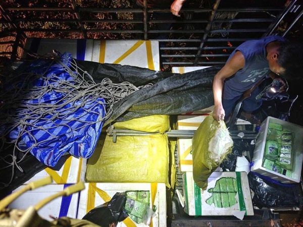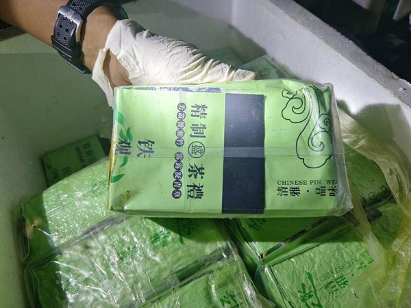 จากการตรวจค้นในกระบะรถพบลังโฟม 18 ใบ และกระสอบสีเขียว 20 ใบ ภายในพบยาเคตามีน บรรจุอยู่ในถุงชาสีเขียวอ่อน ประทับอักษรภาษาจีน และรูปถ้วยชา จำนวน 938 ถุง รวมน้ำหนัก 938 กิโลกรัม