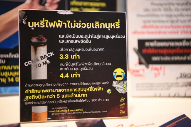 “ขณะที่คนที่ได้รับไอบุหรี่ไฟฟ้ามือสองก็มีอันตรายเช่นกัน ทำให้หลอดลมตีบ เบื้องต้นมีหลักฐานเชื่อมโยงการเกิดมะเร็งปอดและมะเร็งกระเพาะปัสสาวะ ผลกระทบระยะยาวยังไม่ทราบแน่ชัด แต่มีผลกระทบทำลายสุขภาพแน่ๆ เช่น ถุงลมโป่งพองที่สามารถเกิดขึ้นได้ ที่น่าห่วงคือ บุหรี่ไฟฟ้าไม่ช่วยลดการสูบ แต่กลับทำให้สูบมากขึ้น ยิ่งการสูบตั้งแต่เด็กจะนำไปสู่การสูบบุหรี่มวนด้วย โดยสูบทั้งสองอย่างควบคู่กัน ซึ่งธุรกิจยาสูบออกผลิตภัณฑ์บุหรี่ไฟฟ้ามุ่งเป้าล่อลวงเด็ก เยาวชน และผู้หญิง” รศ.นพ.สุทัศน์ กล่าว