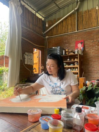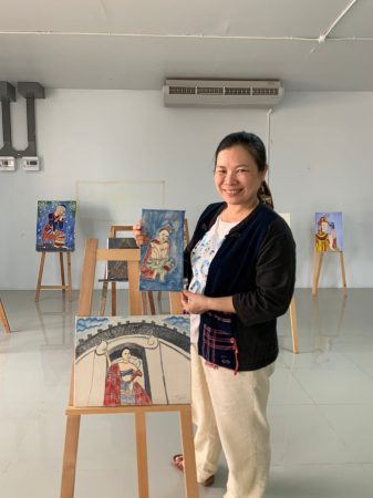 นางสาวอภิญญาตา ทนะขว้าง นักวิชาการวัฒนธรรมชำนาญการ สำนักงานวัฒนธรรมจังหวัดน่าน ผู้ที่ชื่นชอบและศึกษาการวาดภาพจิตรกรรมมาโดยตลอด ได้เรียนรู้การวาดภาพจิตรกรรมฝาผนังสกุลช่างน่าน จากศูนย์การเรียนรู้พุทธศิลป์วัดแสงดาว หลักสูตร 1 เดือนเต็ม เมื่อช่วงเดือนมีนาคม 2566 ที่ผ่านมา โดยฝึกวาดตั้งแต่เริ่มต้นลงลายเส้น จนถึงการลงสีธรรมชาติ ทำกาวมะขามผสมดินสอพอง รองพื้นเฟรมสำหรับวาดภาพ ศิลปะสกุลช่างน่านแบบโบราณดั้งเดิม จากภูมิความรู้ สู่การฝึกฝน วันนี้สามารถวาดภาพจิตรกรรมได้อย่างสวยงาม สิ่งสำคัญคือการได้ซึมซับองค์ความรู้ภูมิปัญญาที่หาเรียนได้ยาก ยิ่งวาดไปเรียนรู้ไป ก็ยิ่งรู้สึกอินกับงานภาพวาดจิตรกรรมฝาผนังและงานสกุลช่างน่าน ซึ่งในอนาคตมุ่งหวังให้งานวาดภาพจิตรกรรมของตน มีคนชื่นชอบและยอมจ่ายเพื่อได้เป็นเจ้าของ ถึงแม้ไม่ได้หวังให้ถึงกับเป็นอาชีพหรือสร้างรายได้ แต่ก็อยากให้ภาพวาดของตนเองขายได้ โดยพี่ๆ ที่ไปเรียนพร้อมกันในหลักสูตรนี้ สามารถขายภาพวาดของตัวเองกันได้แล้วด้วย