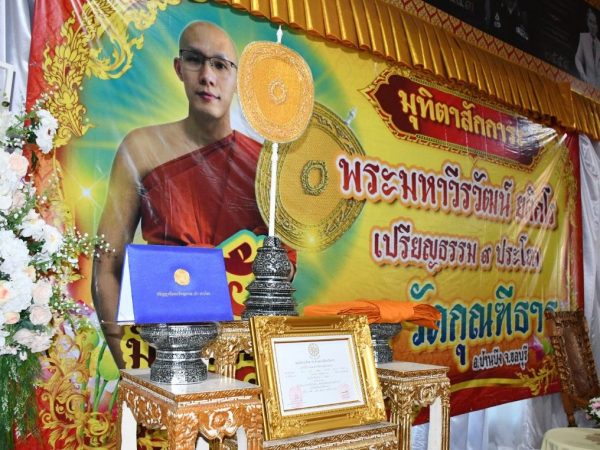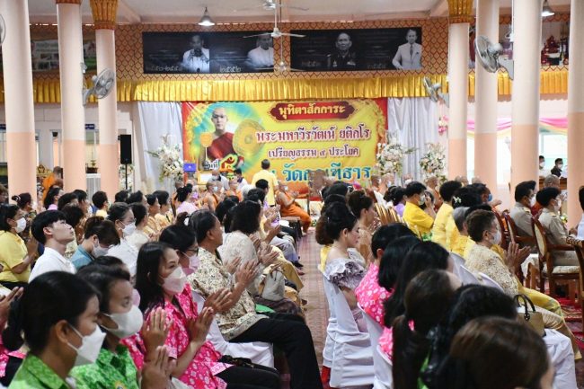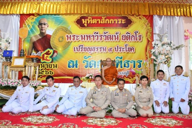 เมื่อเวลา 09.30 น.วันที่ 5 มิถุนายน 2566 พระเดชพระคุณพระธรรมราชานุวัตร รองแม่กองบาลีสนามหลวงประจำภาคตะวันออก เจ้าคณะภาค 10 เจ้าอาวาสวัดโมลีโลกยาราม เป็นประธานฝ่ายสงฆ์ นายธวัชชัย ศรีทอง ผู้ว่าราชการจังหวัดชลบุรี เป็นประธานฝ่ายฆราวาส ในพิธีฉลองปริญญาบัตรพัดยศ เปรียญธรรม เก้าประโยค และถวายมุทิตาจิตแด่พระมหาวีรวัฒน์ ยติกโร โดยมี นางหนึ่งฤทัย พูลลาภ ผู้อำนวยการสำนักงานพระพุทธศาสนาจังหวัดชลบุรี นางศุภาวี บำรุงศักดิ์ วัฒนธรรมจังหวัดชลบุรี นายสมศักดิ์ จุฑาวงศ์กุล นายอำเภอบ้านบึง เจ้าหน้าที่ที่เกี่ยวข้องและพุทธศาสนิกชนร่วมพิธีเป็นจำนวนมาก ณ ศาลาการเปรียญ วัดกุณฑีธาร ตำบลคลองกิ่ว อำเภอบ้านบึง จังหวัดชลบุรี