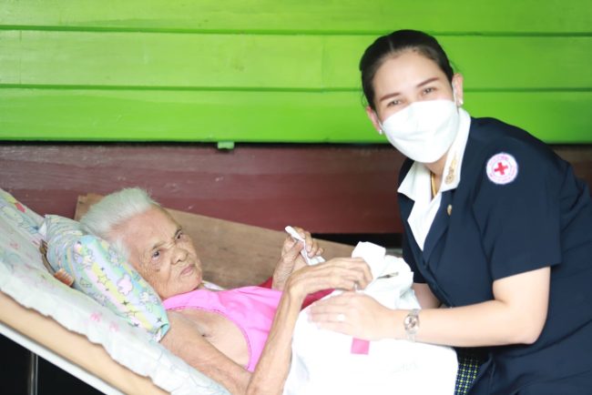 จากนั้น ผู้ว่าราชการจังหวัดชลบุรี นายกเหล่ากาชาดจังหวัดชลบุรี พร้อมคณะกรรมการเหล่ากาชาดจังหวัดชลบุรี ได้ลงพื้นที่เดินทางไปที่ตำบลดอนหัวฬ่อ อำเภอเมืองชลบุรี เพื่อมอบถุงยังชีพให้ผู้ป่วยติดเตียง จำนวน 3 รายดังนี้