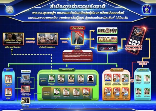 ชุดสืบสวนได้ดําเนินการตรวจสอบเส้นทางการเงินจากกลุ่มผู้ต้องหาพบว่า เว็บไซต์การพนัน ที่เกี่ยวข้องมี 3 เว็บไซต์ ได้แก่ sexy789 red789 และ blue789 โดยมีการแบ่งหน้าที่กันทําอย่างชัดเจนในการเป็นแอดมิน และการจัดหาบัญชีม้า เจ้าหน้าที่ตํารวจสามารถรวบรวมพยานหลักฐานและดําเนินคดีกับผู้ต้องหาได้เพิ่มเติม จํานวน 9 รายโดยได้จับกุมและแจ้งข้อกล่าวครบแล้วทั้งหมดประกอบด้วย