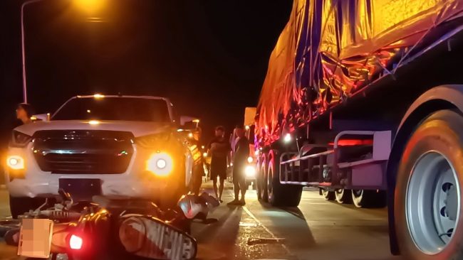 สลด!ลุงขี่ จยย.เฉี่ยวกระบะร่างกระเด็นมุดใต้รถพ่วงโดนทับดับสยองคาล้อ