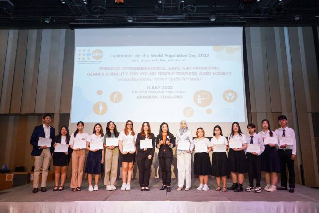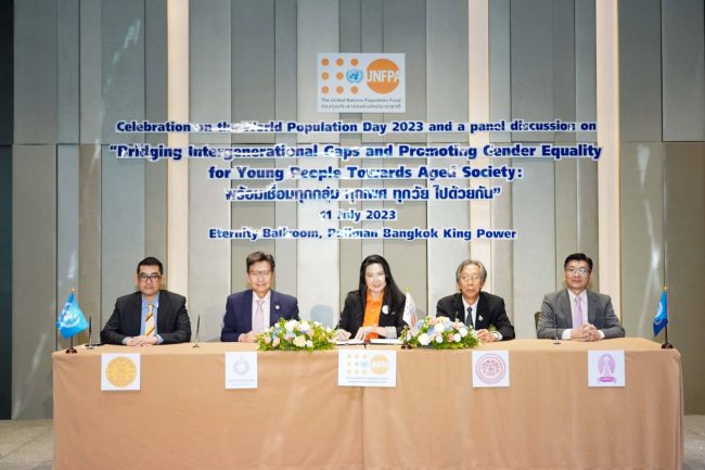 กองทุนประชากรแห่งสหประชาชาติ ประจำประเทศไทย (UNFPA Thailand) จัดงานวันประชากรโลก ประจำปี 2566 (The World Population Day 2023) ร่วมกันแสดงออกและตระหนักในประเด็นปัญหาของประชากรโลก ส่งเสริมสนับสนุนให้ความรู้สิทธิพื้นฐาน การวางแผนครอบครัว เพื่อนำไปสู่การมีประชากรโลกที่มีคุณภาพชีวิตที่ดี พร้อมจัดลงนาม MOU ร่วมกับ 4 หน่วยงานสำคัญ จัดเวทีเสวนา “Bridging Intergenerational Gaps and Promoting Gender Equality for Young People Towards Aged Society: พร้อมเชื่อมทุกกลุ่ม ทุกเพศ ทุกวัย ไปด้วยกัน” พร้อมด้วยการมอบรางวัล Social Media Contest โดยมีผู้แทนหน่วนงานองค์กรภาครัฐ ภาคประชาสังคม ภาคเอกชน นิสิตนักศึกษา สื่อมวลชน และผู้สนใจ ร่วมงานอย่างคับคั่ง