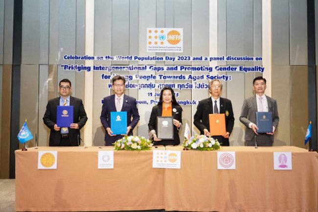 กองทุนประชากรแห่งสหประชาชาติ ประจำประเทศไทย (UNFPA Thailand) จัดงานวันประชากรโลก ประจำปี 2566 (The World Population Day 2023) ร่วมกันแสดงออกและตระหนักในประเด็นปัญหาของประชากรโลก ส่งเสริมสนับสนุนให้ความรู้สิทธิพื้นฐาน การวางแผนครอบครัว เพื่อนำไปสู่การมีประชากรโลกที่มีคุณภาพชีวิตที่ดี พร้อมจัดลงนาม MOU ร่วมกับ 4 หน่วยงานสำคัญ จัดเวทีเสวนา “Bridging Intergenerational Gaps and Promoting Gender Equality for Young People Towards Aged Society: พร้อมเชื่อมทุกกลุ่ม ทุกเพศ ทุกวัย ไปด้วยกัน” พร้อมด้วยการมอบรางวัล Social Media Contest โดยมีผู้แทนหน่วนงานองค์กรภาครัฐ ภาคประชาสังคม ภาคเอกชน นิสิตนักศึกษา สื่อมวลชน และผู้สนใจ ร่วมงานอย่างคับคั่ง