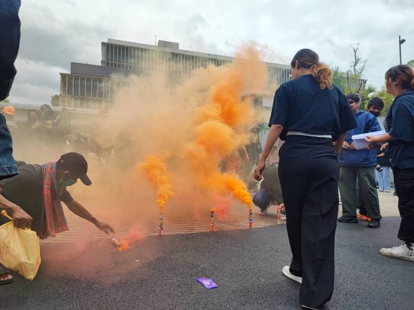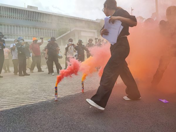 ต่อมา น.ส.ทานตะวัน หรือ ตะวัน ตัวตุลานนท์ และ น.ส.อรวรรณ หรือ แบม ภู่พงษ์ พร้อมกลุ่มทะลุวัง ได้จุดพลุควัน พร้อมกับปาประทัดกระเทียมลงพื้นด้วย ก่อนที่จะวิ่งไปบริเวณหน้าประตูแล้วโปรยใบปลิวเข้าไปด้านในรัฐสภา