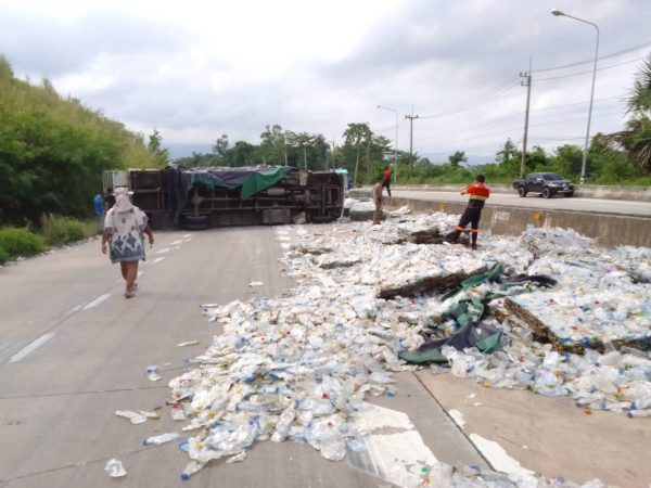 ระทึก!รถบรรทุก 6 ล้อเบรกแตกพลิกคว่ำเทกระจาดขวดน้ำรีไซเคิลเกลื่อนถนน