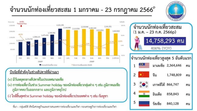โดยสัปดาห์ที่ผ่านมาภาพรวมไทยมีจำนวนนักท่องเที่ยวต่างชาติทั้งสิ้น 566,611 คนโดย 5 อันดับแรกของนักท่องเที่ยวต่างชาติ ได้แก่ จีน มาเลเซีย เกาหลีใต้ เวียดนาม และอินเดีย ซึ่งคิดเป็นร้อยละ 47.4 ของนักท่องเที่ยวต่างชาติทั้งหมด ทั้งนี้ กองเศรษฐกิจการท่องเที่ยวและกีฬาคาดการณ์จำนวนนักท่องเที่ยวต่างชาติที่เดินทางเข้าไทยยังคงเป็นไปตามเป้าหมาย จากปัจจัยแวดล้อมที่ยังส่งสัญญาณบวกต่อการเติบโตของนักท่องเที่ยวอย่างต่อเนื่อง และสัปดาห์ถัดไป คาดว่านักท่องเที่ยวต่างชาติจะเดินทางเข้าไทย ราว 570,000 คน จากตลาดอาเซียน เอเชียตะวันออก และตะวันออกกลาง เป็นหลัก