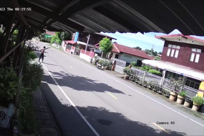 โดยวงจรปิดจับภาพเอาไว้ได้ขณะที่นายธนพลอายุ 36 ปี หรือ “อั๋น” คลุ้มคลั่งถือไม้หน้าสามไปหาเรื่องเพื่อนบ้านที่อยู่ฝั่งตรงข้าม พร้อมโวยวายชี้หน้าให้เพื่อนบ้านออกมาจากบ้านเพื่อมาดวลกัน แต่เพื่อนบ้านไม่ออกมา ต่อมานายอั๋นได้เดินถือมีด ไปหาน้าชาย พร้อมขู่ว่าน้าชายยืมเงินไป 200,000 บาทไม่ยอมใช้คืนและพยายามหาเรื่องตลอดเวลา สุดท้ายน้าชายแจ้งตร.มาจับกุมตัวไปสงบสติอารมณ์ที่สภ.หนองหานพร้อมกับแจ้งความดำเนินคดี