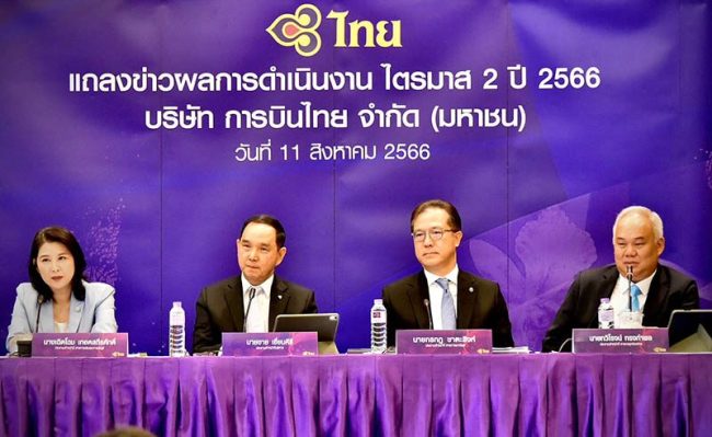 นายชาย เอี่ยมศิริ ประธานเจ้าหน้าที่บริหารบริษัทการบินไทย จำกัด (มหาชน) เปิดเผยว่า บริษัทฯ และบริษัทย่อยมีรายได้รวม (ไม่รวมรายการที่เกิดขึ้นครั้งเดียว) ทั้งสิ้น 37,381 ล้านบาท เพิ่มขึ้นจากช่วงเดียวกันของปีก่อนซึ่งมีรายได้รวม 21,526 ล้านบาท หรือ 73.7% แต่ลดลง 9.9% จากไตรมาสแรกของปี 2566 ซึ่งเป็นไปตามปกติของธุรกิจที่ไตรมาส 2 จะเป็นช่วงที่มีผู้โดยสารเดินทางต่ำที่สุดในช่วงปี
