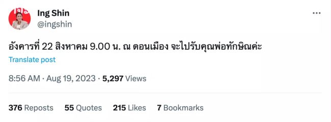 ล่าสุดเมื่อเวลา 08.48 น. วันที่ 19 สิงหาคม 2566 น.ส.แพทองธาร ชินวัตร หัวหน้าครอบครัวเพื่อไทยและแคนดิเดตนายกรัฐมนตรีพรรคเพื่อไทย ลูกสาวคนเล็กของนายทักษิณ ได้ประกาศผ่านสตอรี่อินสตาแกรม และทวิตเตอร์ ว่า “อังคารที่ 22 สิงหาคม 9.00 น. ณ ดอนเมือง จะไปรับคุณพ่อทักษิณค่ะ”