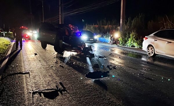สงขลา-สาวขับกระบะ ขนน้ำมันเถื่อน เบรกไม่อยู่ พุ่งเสยท้ายรถเทรลเลอร์ เครื่องหยุดหลุด ถังน้ำมันแตกไหลนองเต็มพื้นถนน ในพื้นที่ จ.สงขลา บาดเจ็บ 1 ราย